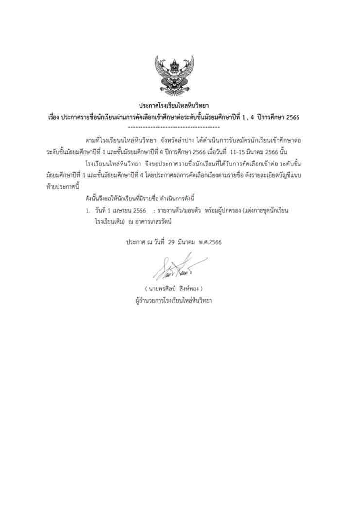 ประกาศรายชื่อนักเรียนที่ผ่านการคัดเลือกเข้าศึกษาต่อระดับมัธยมศึกษาปีที่ 1,4 ปีการศึกษา 2566