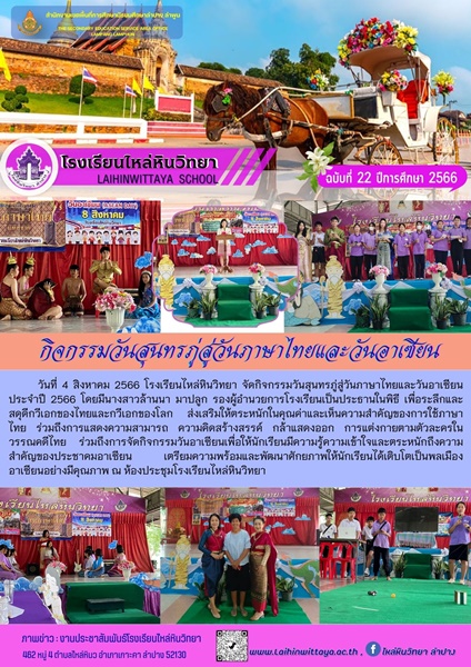 วันที่ 4 สิงหาคม 2566 โรงเรียนไหล่หินวิทยา จัดกิจกรรมวันสุนทรภู่สู่วันภาษาไทยและวันอาเซียนประจำปี 2566 โดยมีนางสาวล้านนา มาปลูก รองผู้อำนวยการโรงเรียนเป็นประธานในพิธี เพื่อระลึกและสดุดีกวีเอกของไทยและกวีเอกของโลก ส่งเสริมให้ตระหนักในคุณค่าและเห็นความสำคัญของการใช้ภาษาไทย ร่วมถึงการแสดงความสามารถ ความคิดสร้างสรรค์ กล้าแสดงออก การแต่งกายตามตัวละครในวรรณคดีไทย ร่วมถึงการจัดกิจกรรมวันอาเซียนเพื่อให้นักเรียนมีความรู้ความเข้าใจและตระหนักถึงความสำคัญของประชาคมอาเซียน เตรียมความพร้อมและพัฒนาศักยภาพให้นักเรียนได้เติบโตเป็นพลเมืองอาเซียนอย่างมีคุณภาพ ณ ห้องประชุมโรงเรียนไหล่หินวิทยา |