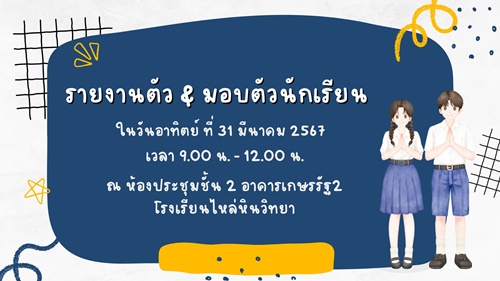 ให้นักเรียนที่มีรายชื่อ รายงานตัวและมอบตัว ในวันอาทิตย์ ที่ 31 มีนาคม 2567 เวลา 9.00 น. - 12.00 น. ณ ห้องประชุมชั้น 2 อาคารเกษรรัฐ2 โรงเรียนไหล่หินวิทยา
