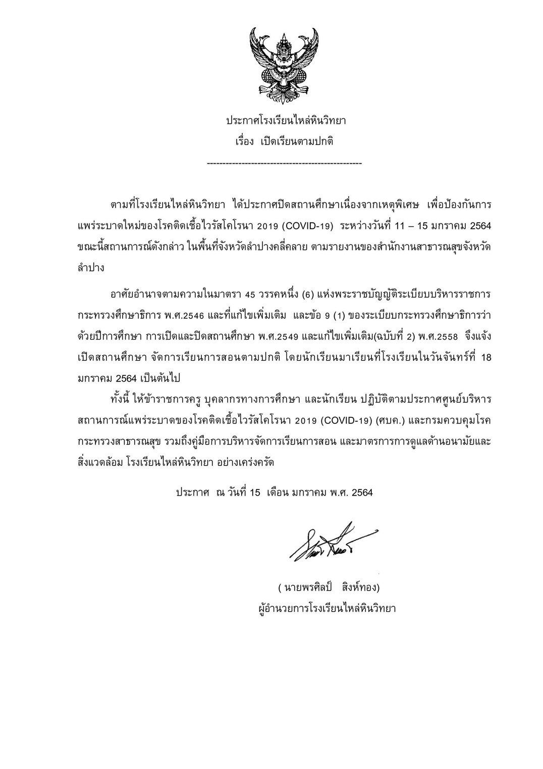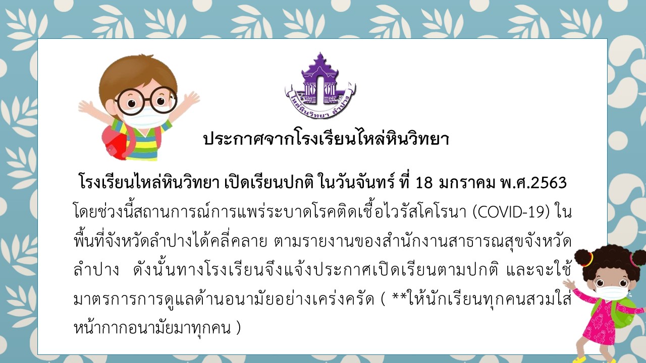 โดยช่วงนี้สถานการณ์การแพร่ระบาดโรคติดเชื้อไวรัสโคโรนา (COVID-19) ในพื้นที่จังหวัดลำปางได้คลี่คลาย ตามรายงานของสำนักงานสาธารณสุขจังหวัดลำปาง ดังนั้นทางโรงเรียนจึงแจ้งประกาศเปิดเรียนตามปกติ และจะใช้มาตรการการดูแลด้านอนามัยอย่างเคร่งครัด ( **ให้นักเรียนสวมใส่หน้ากากอนามัยมาทุกคน )