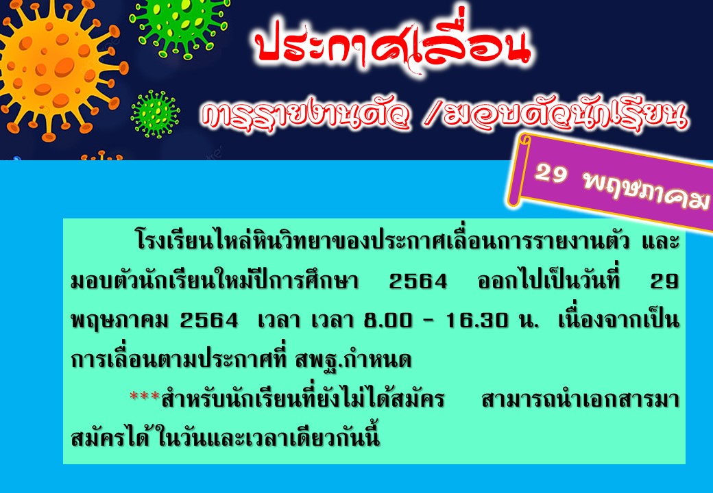 ประกาศเลื่อน การรายงานตัว และมอบตัวนักเรียนใหม่ ปีการศึกษา 2564