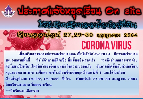 ประกาศแจ้งหยุดเรียน On site เนื่องจากสถานการณ์โควิด19 ครั้งที่ 4