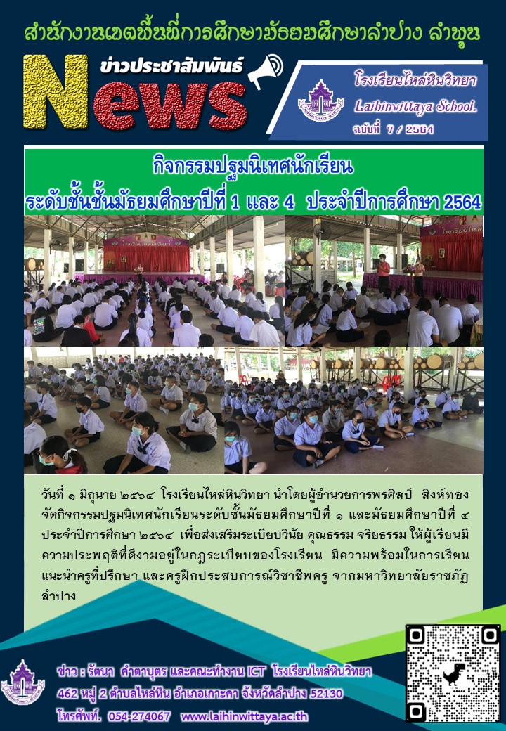 กิจกรรมปฐมนิเทศนักเรียนระดับชั้นมัธยมศึกษาปีที่ 1และ 4 ประจำปีการศึกษา 2564