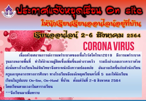 ประชาสัมพันธ์แจ้งหยุดเรียน On site เนื่องจากสถานการณ์โควิด19 ครั้งที่ 5