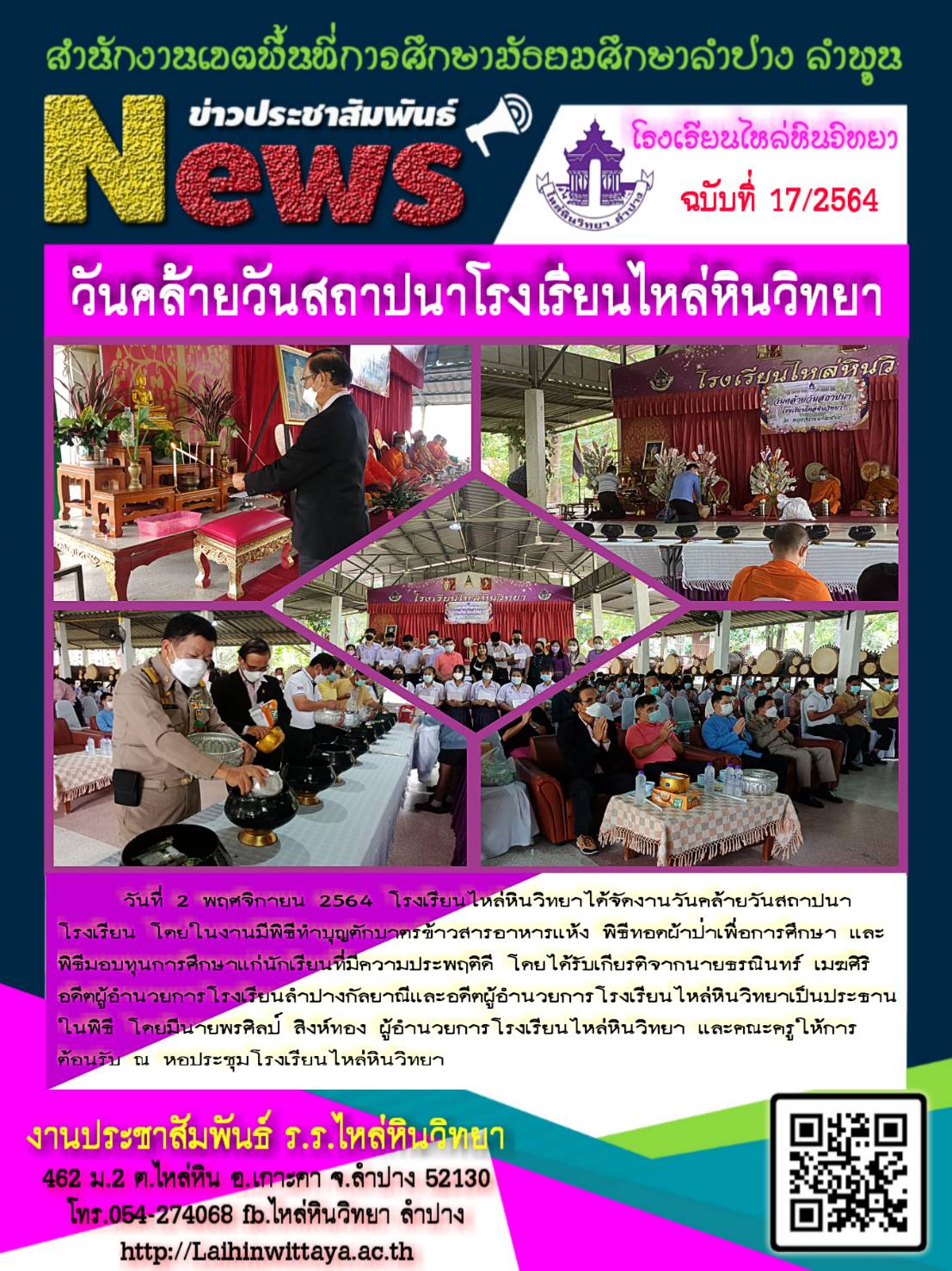 วันที่ 2 พฤศจิกายน 2564 โรงเรียนไหล่หินวิทยาได้จัดงานวันคล้ายวันสถาปนาโรงเรียน โดยในงานมีพิธีทำบุญตักบาตรข้าวสารอาหารแห้ง พิธีทดผ้าป่าเพื่อการศึกษา และพิธีมอบทุุนการศึกษาแก่นักเรียนที่มีความประพฤติดี โดยได้รับเกียรติจากนายธรณินทร์ เมฆศิริ อดีตผู้อำนวยการโรงเรียนลำปางกัลยาณีและอดีตผู้อำนวยการโรงเรียนไหล่หินวิทยาเป็นประธานในพิธี |