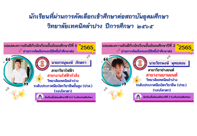 นักเรียนที่ผ่านการคัดเลือกเข้าศึกษาต่อสถาบันอุดมศึกษา วิทยาลัยเทคนิคลำปาง ปีการศึกษา 2565