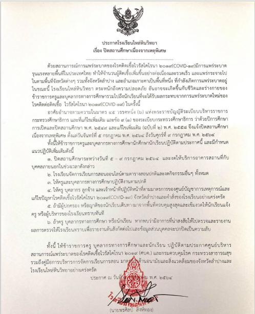 ประกาศแจ้งหยุดเรียน On site เนื่องจากสถานการณ์โควิด19 ครั้งที่ 2