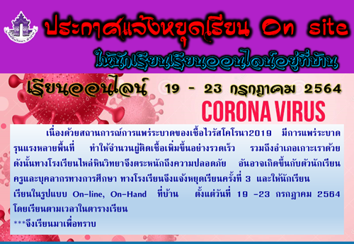 ประกาศแจ้งหยุดเรียน On site เนื่องจากสถานการณ์โควิด19