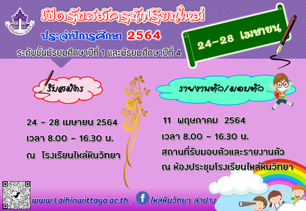ประชาสัมพันธ์การรับนักเรียนใหม่ ปีการศึกษา 2564 ด้วยระบบออนไลน์ Online ***สามารถกดดาวโหลดเพื่อแสกน QR Cord ด้านล่างได้เลยคะ