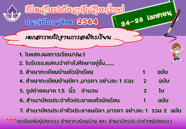 หลักฐานเอกสารการรับสมัครนักเรียนใหม่ ปีการศึกษา 2564